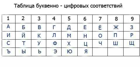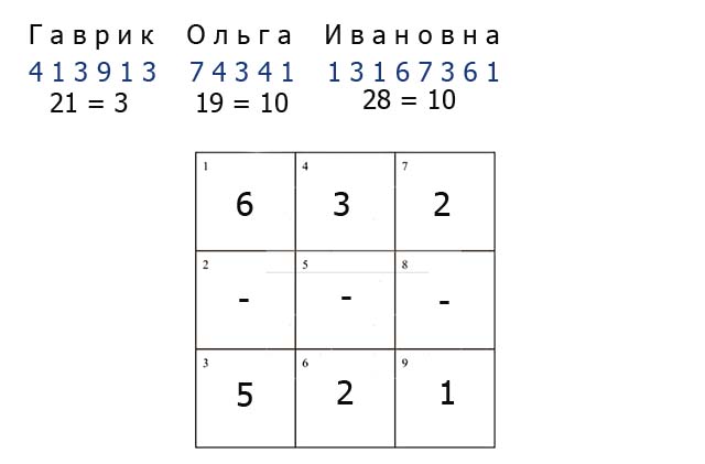Определим число кармического урока на примере имени Гаврик Ольга Ивановна. Записываем числовое значение каждой буквы, затем подсчитываем сколько раз повторяется каждое число. Для удобства результаты вносим в таблицу, как указанно на картинке: