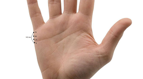 Вы уже знаете, где искать линии взаимоотношений. Приложите линейку к ребру ладони и замерьте расстояние от линии сердца до основания мизинца.