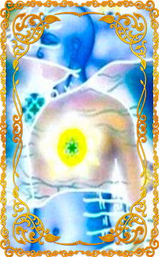 На выбранной карте изображён человек с оголённым торсом, он открыт и уязвим, из его груди исходит сияющий свет, его аура – яркая и чистая. Ещё один символ на карте – это исцеляющие руки мастера рейки, между которыми проходят энергетические разряды.