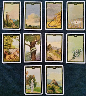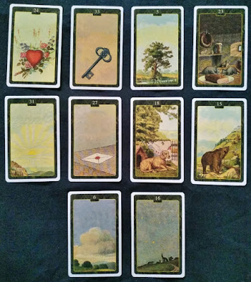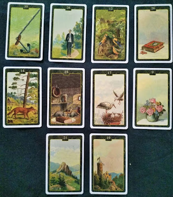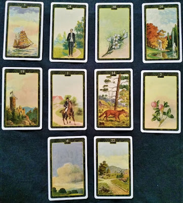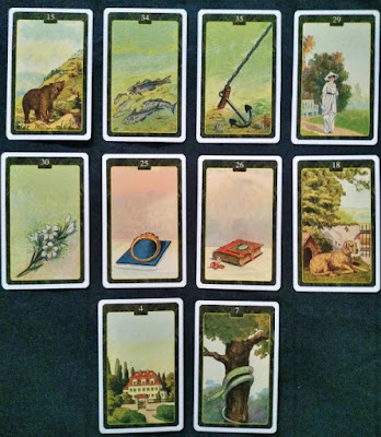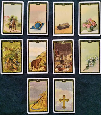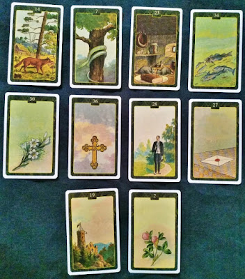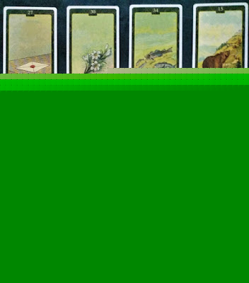 - Средний ряд: первая карта- Лилии(30), вторая- Крест(36), третья- Мужчина(28), четвёртая- Письмо(27).