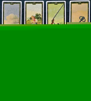 - Верхний ряд: первая карта- Башня(19), вторая- Тучи(6), третья- Коса(10), четвёртая- Письмо(27).