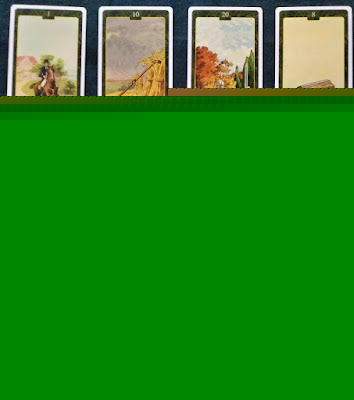 - Верхний ряд: первая карта- Всадник(1), вторая- Коса(10), третья- Сад(20), четвёртая- Гроб(8).