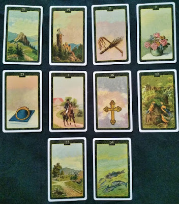 - Средний ряд: первая карта- Кольцо(25), вторая- Всадник(1), третья- Крест(36), четвёртая- Птицы(12).