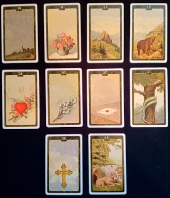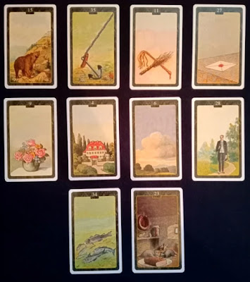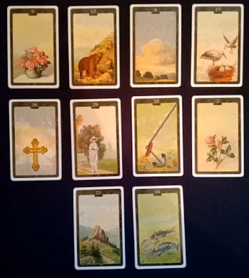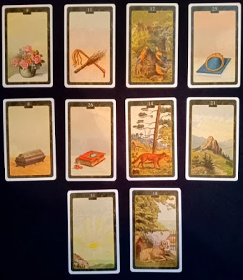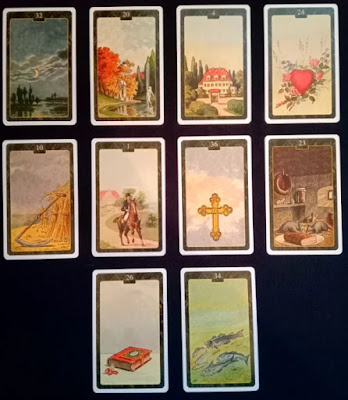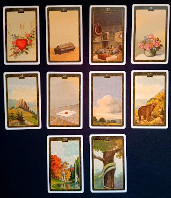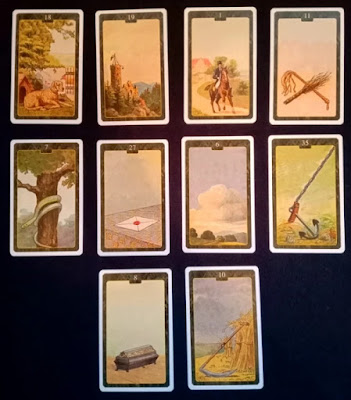 Средний ряд: первая карта- Коса(10), вторая- Всадник(1), третья- Крест(36), четвёртая- Крысы(23).