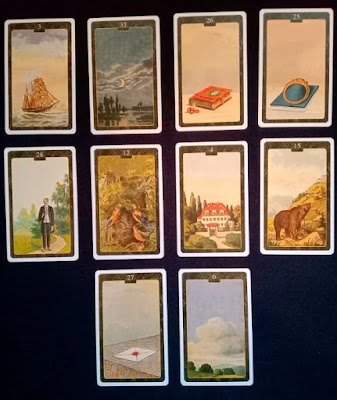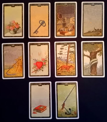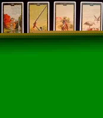 19. Верхний ряд: первая карта- Сад(20), вторая- Якорь(35), третья- Всадник(1), четвёртая- Аист(17).