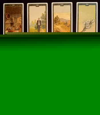 28. Средний ряд: первая карта- Коса(10), вторая- Всадник(1), третья- Крест(36), четвёртая- Крысы(23).