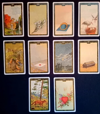 Средний ряд: первая карта- Птицы(12), вторая- Письмо(27), третья- Луна(32), четвёртая- Гроб(8).