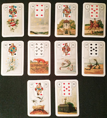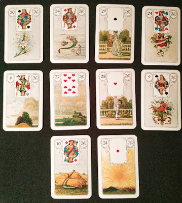 - Верхний ряд: первая карта- Письмо(27), вторая- Лилии(30), третья- Метла(11), четвёртая- Рыбы(34).