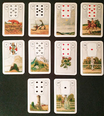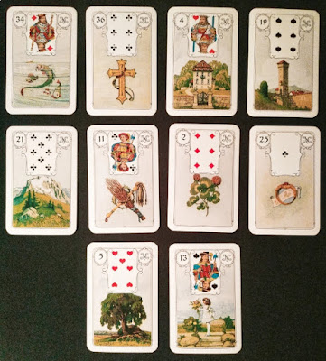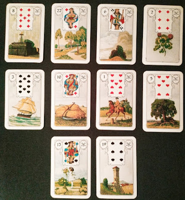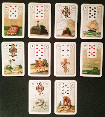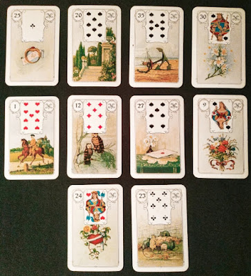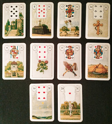 - Средний ряд: первая карта- Всадник(1), вторая- Совы(12), третья- Письмо(27), четвёртая- Букет(9).