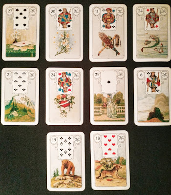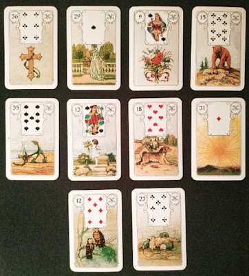 - Верхний ряд: первая карта- Крест(36), вторая- Женщина(29), третья- Букет(9), четвёртая- Медведь(15).