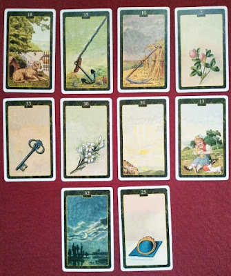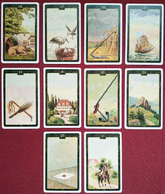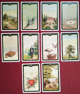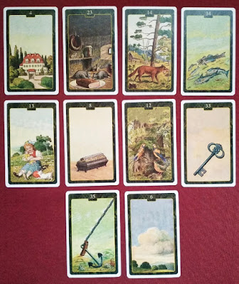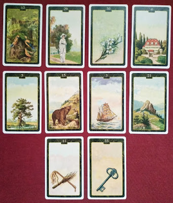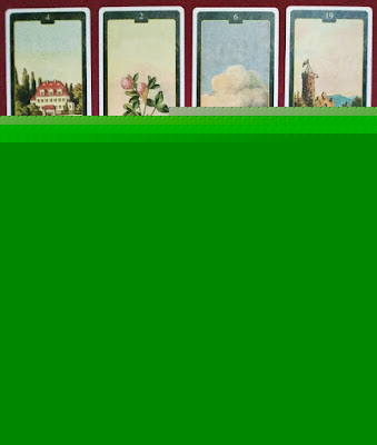 - Верхний ряд: первая карта- Птицы(12), вторая- Женщина(29), третья- Лилии(30), четвёртая- Дом(4).