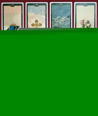 Верхний ряд: первая карта- Кольцо(25), вторая- Крест(36), третья- Луна(32), четвёртая- Клевер(2).