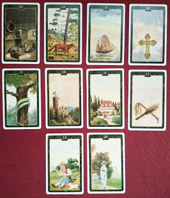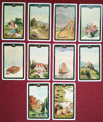 - Верхний ряд: первая карта- Развилка(22), вторая- Лилии(30), третья- Дом(4), четвёртая- Письмо(27).