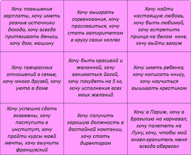Теперь просто запишите в него свои самые заветные желания (делать это лучше карандашом красного цвета, а не ручкой или фломастером). Чем больше их будет, тем лучше. Записывайте даже мелкие капризы, они, кстати, быстрее всего исполняются.»