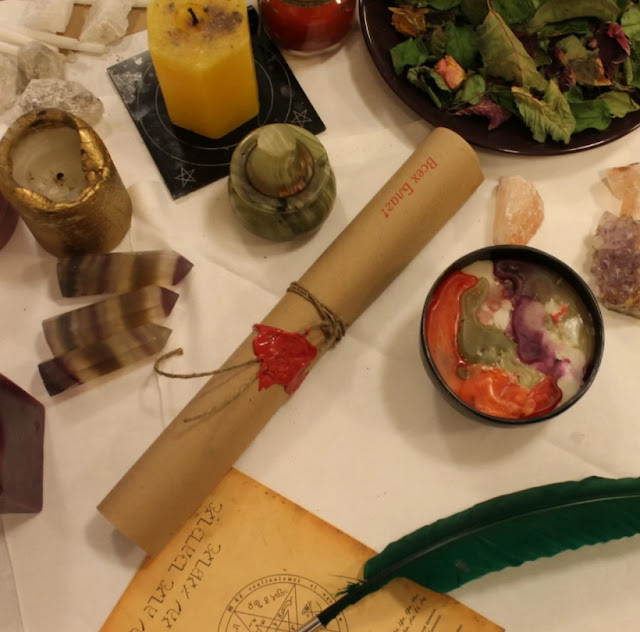 Свиток нужно положить в центре по углам расставить свечи в стеклянных сосудах. Рядом можно разместить талисманы и амулеты и конечно волшебный магнит.
