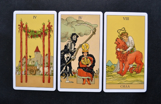 Человек буквально вцепился в вас и не намерен отпускать. Такого собственника поискать еще надо! Все три карты очень статичные, “жадные”. Тут и купец за денежки схватился, и женщина – за льва. Заметили? Так и загаданный человек к вам относится. “Мое! Никому не отдам!” Он думает о том, как укрепить отношения, хочет привязать к себе по-крепче разными способами. В том числе и через хороший секс: карта Сила часто указывает на страсть чистейшего качества.