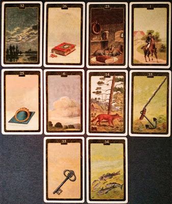 - Верхний ряд: первая карта- Луна(32), вторая- Книга(26), третья- Крысы(23), четвёртая- Всадник(1).