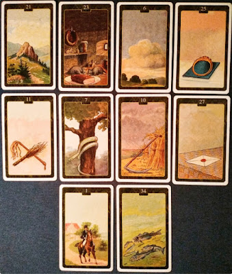 - Средний ряд: первая карта- Метла(11), вторая- Змея(7), третья- Коса(10), четвёртая- Письмо(27).