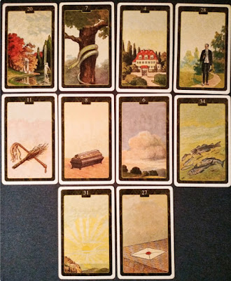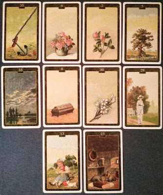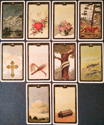 Средний ряд: первая карта- Луна(32), вторая-Гроб(8), третья- Лилии(30), четвёртая- Женщина(29).
