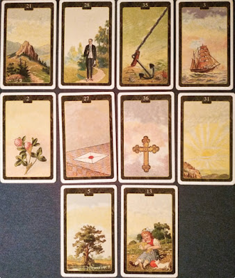 - Верхний ряд: первая карта- Крест(36), вторая- Книга(26), третья- Развилка(22), четвёртая- Всадник(1).