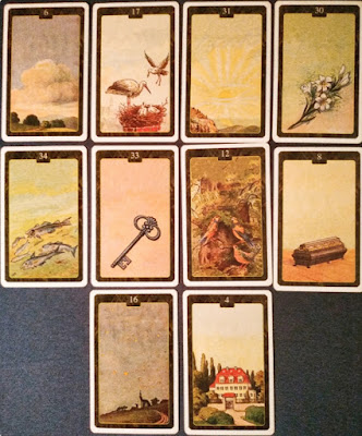 - Верхний ряд: первая карта- Змея(7), вторая- Женщина(29), третья- Букет(9), четвёртая- Крест(36).