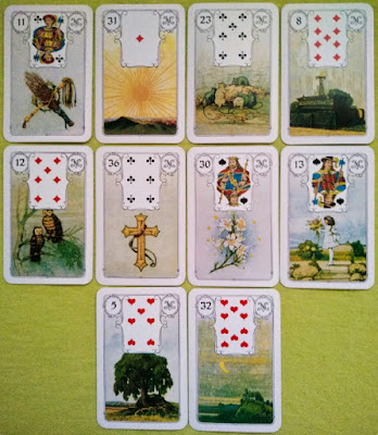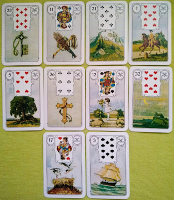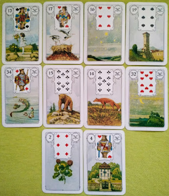 - Средний ряд: первая карта- Дерево(5), вторая- Крест(36), третья- Ребёнок(13), четвёртая- Луна(32).