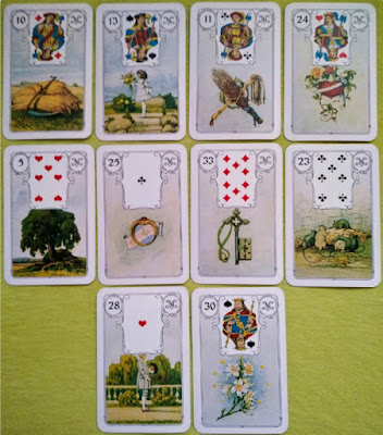 - Верхний ряд: первая карта- Ключ(33), вторая- Метла(11), третья- Гора(21), четвёртая- Всадник(1).