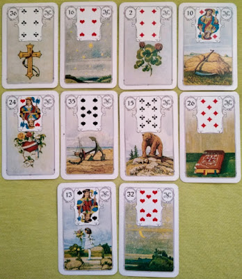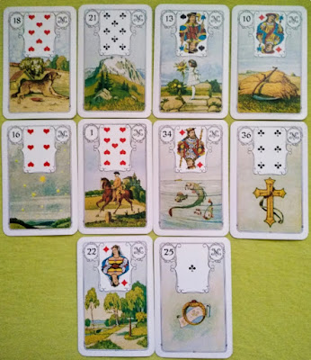 - Верхний ряд: первая карта- Крест(36), вторая- Звёзды(16), третья- Клевер(2), четвёртая- Коса(10).