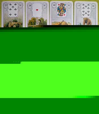 - Верхний ряд: первая карта- Метла(11), вторая- Солнце(31), третья- Крысы(23), четвёртая- Гроб(8).