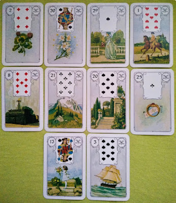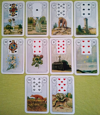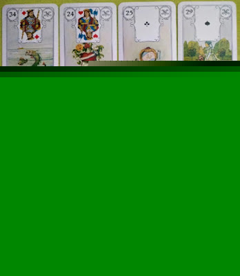- Верхний ряд: первая карта- Клевер(2), вторая- Лилии(30), третья- Женщина(29), четвёртая- Всадник(1).