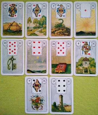 Верхний ряд: первая карта- Коса(10), вторая- Развилка(22), третья- Змея(7), четвёртая- Солнце(31).