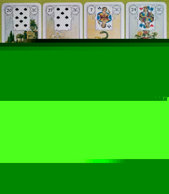 - Верхний ряд: первая карта- Сад(20), вторая- Письмо(27), третья- Змея(7), четвёртая- Сердце(24).