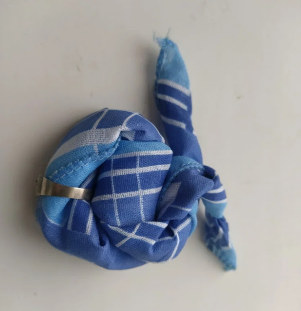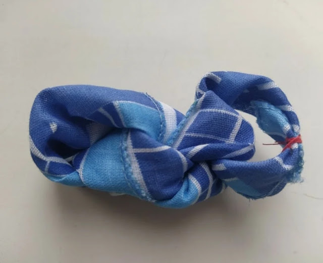 Разложите платок на столе и скрутите по диагонали. Теперь платок продевается в кольцо до середины. Завязываете на три узла, но узлы не завязываете туго, потом надо будет их развязать, разрезать нельзя.