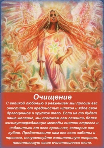 Дополнительные значения: Используйте для очищения организма лекарственные растения, такие как сок пырея или семена подорожника. – Проконсультируйтесь у диетолога, придерживающегося принципов холистической медицины. – Попросите архангела Рафаила помочь вам преодолеть тягу к вредным веществам. – Избегайте ситуации и отношений, заряженных негативной энергией. – Попросите Архангела Михаила очистить ваше тело и ваш дом от отрицательной энергии – Используйте экологически чистые моющие средства.
