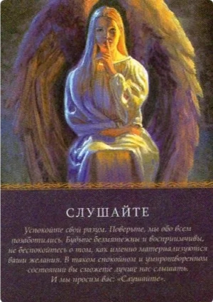 Дополнительные значения этой карты. Избегайте шумной обстановки. Вы правильно услышали сообщение ангелов. Выключите телевизор и радио. Ваш слух обостряется, потому что вы настроены на волну ангелов. Очистите ушные чакры, визуализируя свет, очищающий область лба над каждой бровью.