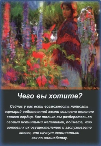 Доп. знач. карты: – Используйте аффирмации и позитивную визуализацию для осуществления желаний. – Разберитесь в своих подлинных желаниях. – Не бойтесь и не стесняйтесь просить о том, чего вы хотите. – Не ограничивайте себя, прося меньшего.