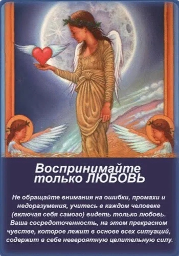 Дополнительные значения этой карты.- Старайтесь видеть в людях не только их внешние качества, но и ангела, кроющегося в каждом из них (если вам трудно это сделать, обратитесь к ангелам – и они вам помогут). – Умейте прощать. – Отошлите ангелам все свои негативные чувства и обиды. – Думайте о том, чего вы хотите, а не чего боитесь.