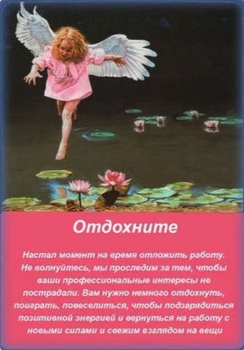 Дополнительные значения этой карты. Прервите работу и отдохните или повеселитесь прямо сейчас. Вы заслуживаете счастья, удовольствий и наслаждений. Следите за тем, чтобы ваши игры и развлечения были чистой забавой и не основывались на конкуренции
