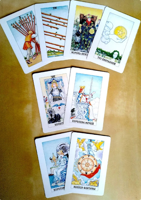 Третья карта говорит о том, какие неприятные события могут произойти. Десятка пентаклей указывает на проблемы в семье, ссору с кем-то из родственников.