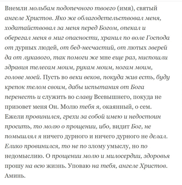 Помните и о том, что когда вы молитесь за свое здоровье или скорейшего выздоровления. Не забывайте попросить у Ангела Хранителя здоровья на будущее. Эту чудесную молитву стоит читать каждый день с утра и перед отходом ко сну. Ангел Хранитель любит вас и беспокоится об вашем здоровье и благополучии, стараясь уберечь вас от всех проблем. Ниже представлена молитва. Чудесная молитва к Ангелу Хранителю об избавлении от болезней своих. Молитва за здоровье на каждый день