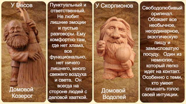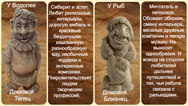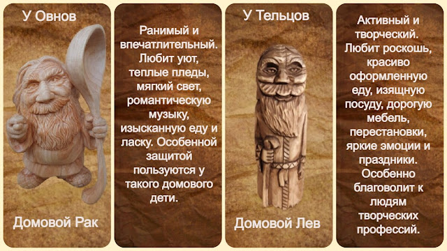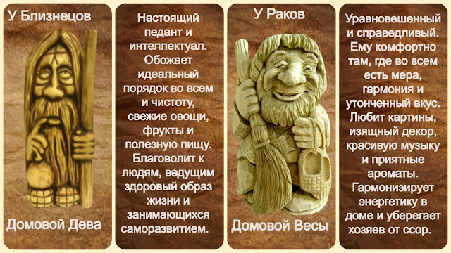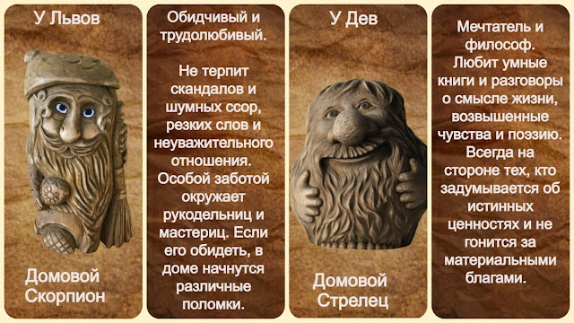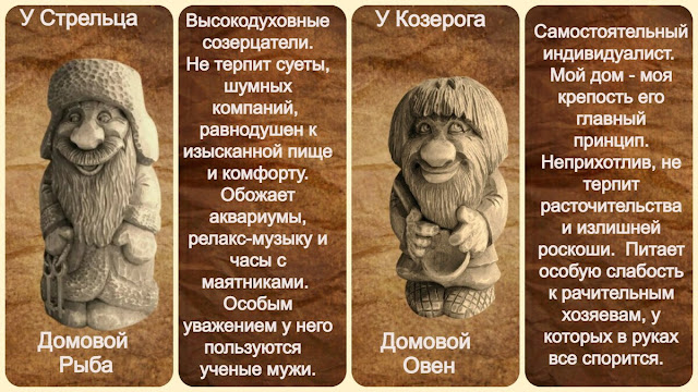 Считается, что семейными делами и домашним очагом ведает у человека не его собственный знак Зодиака, а третий или четвертый, следующий за ним. То есть характер хозяина дома – Домового – будет соответствовать этому знаку. Они перед вами на фото ниже.
