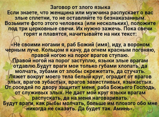 «Рот твой (имя) закрыла, водой залила, молчать тебе рыбой немой, против меня не трещать. Да будет так».